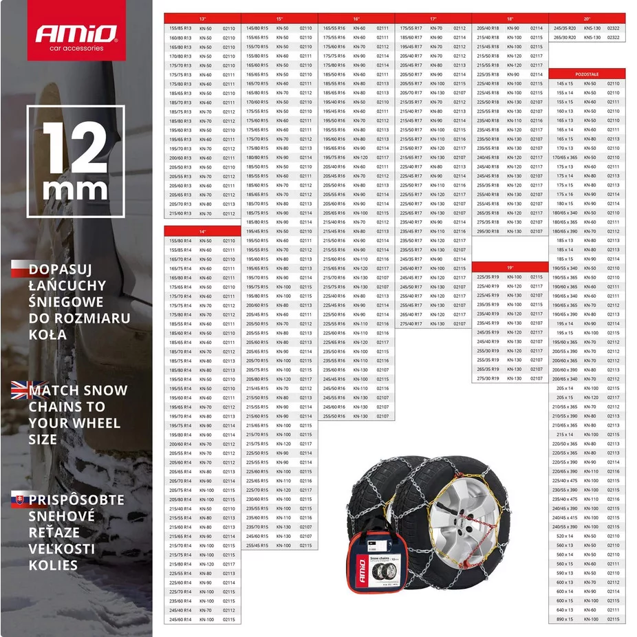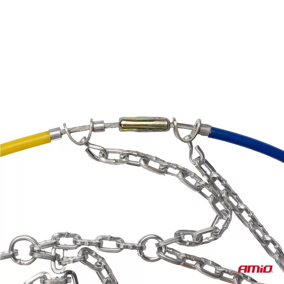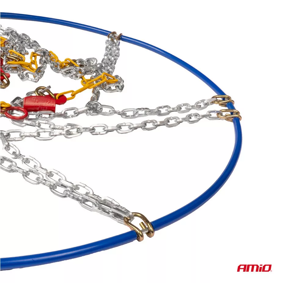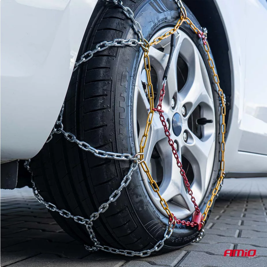Edzett acélból készült, aszimmetrikus, rombusz alakú láncmintázattal. Ez javítja a kerekek tapadását havas vagy jeges felületeken. Erős, 12 mm magas, négyzet keresztmetszetű láncszemek.