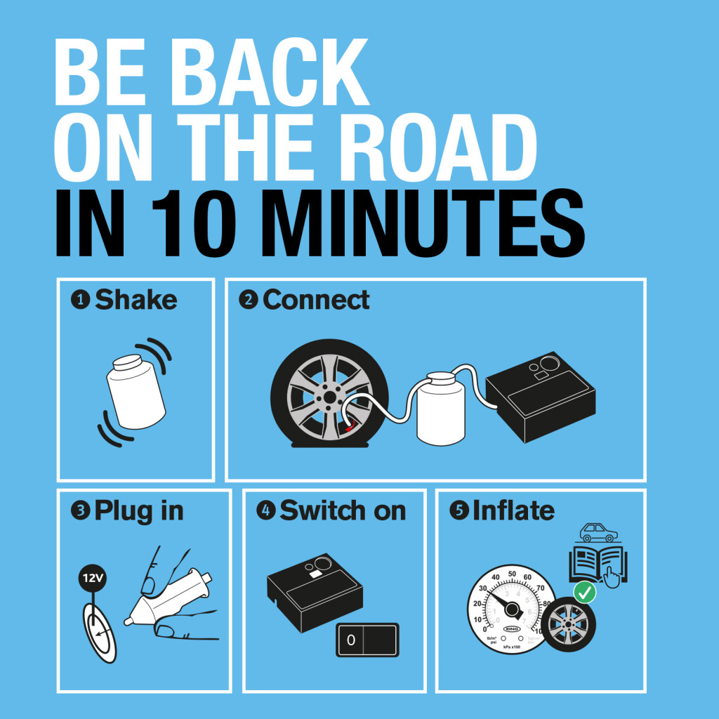 A defektjavítóval akár 200 km/125 mérföldet is megtehet 80 km/h sebességgel, mielőtt szakemberre lenne szüksége, így biztonságosan és gyorsan hazaérhet.