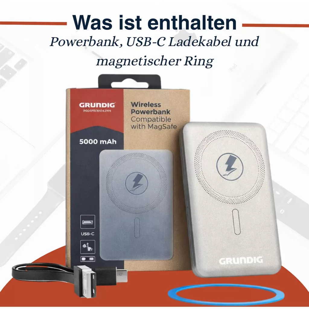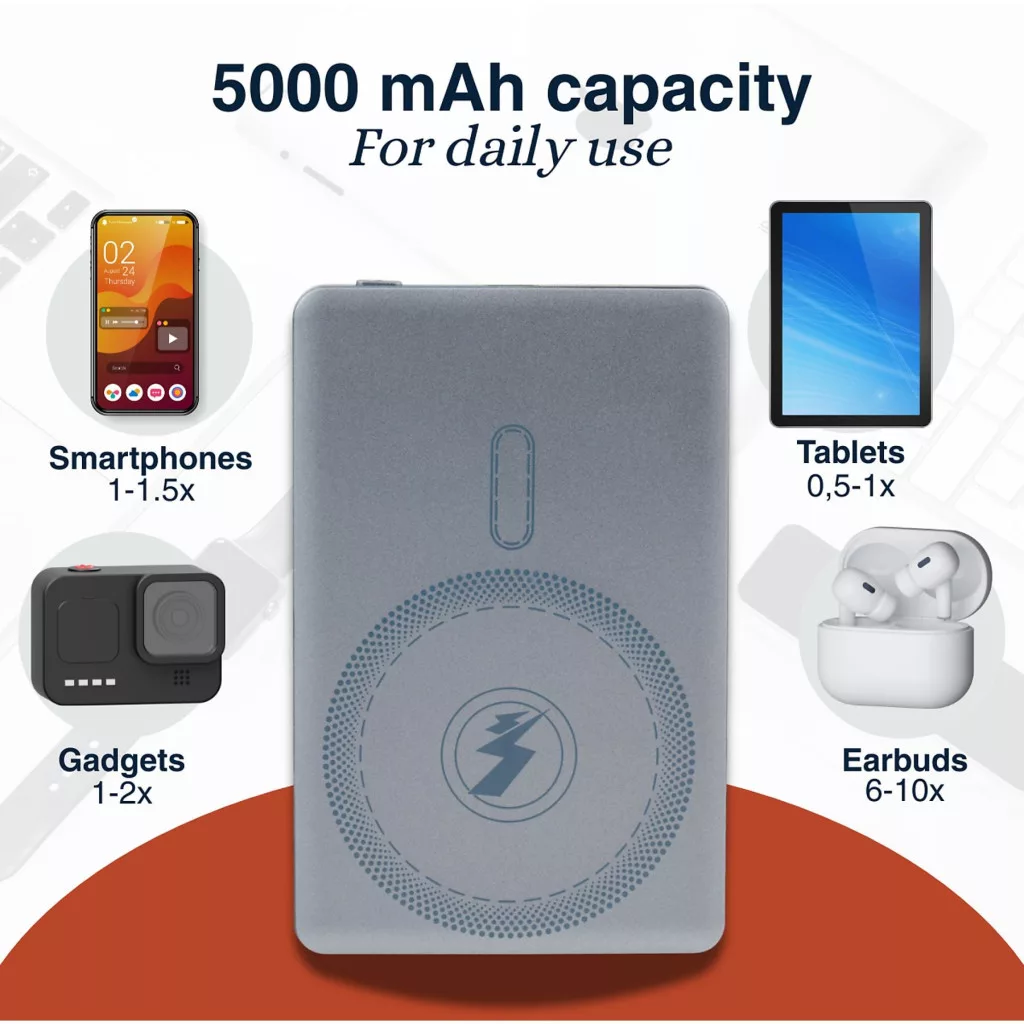 Maradj mindig mobil a Grundig vezeték nélküli 5000mAh-s külső akkumulátorral. Ez a vékony és kompakt külső akkumulátor támogatja a vezeték nélküli töltést, és kompatibilis a MagSafe-fel. Ideális útközben, az irodában vagy utazás közben.