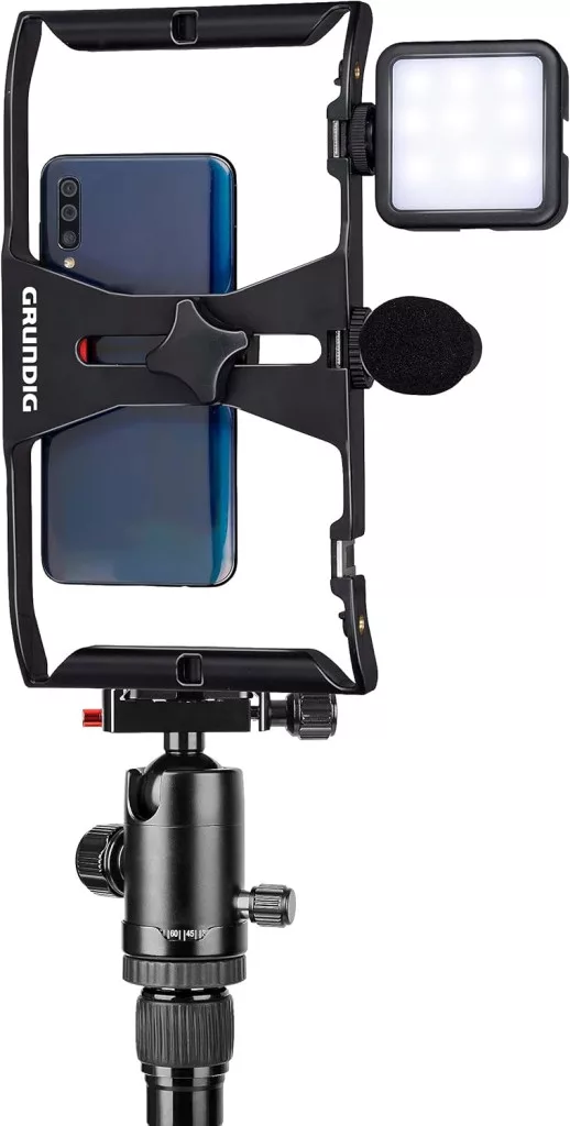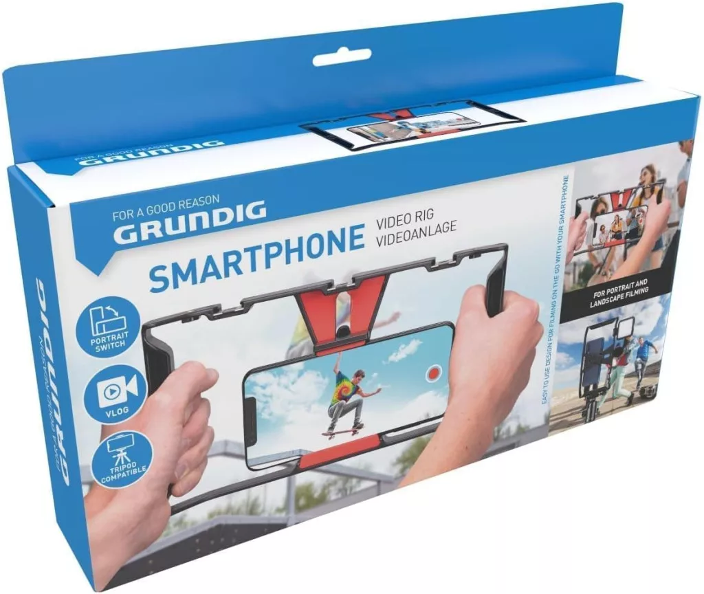 A Grundig Smartphone Video Rig vízszintes és függőleges filmezéshez kínált kiegészítő markolat mellett lehetőség van különféle tartozékok rögzítésére is a tartóhoz a három univerzális 6,35 mm-es csavar és a három vakupapucs-csatlakozó segítségével. Például további lámpákat, mikrofont vagy egyéb audiovizuális tartozékokat adhatsz hozzá.