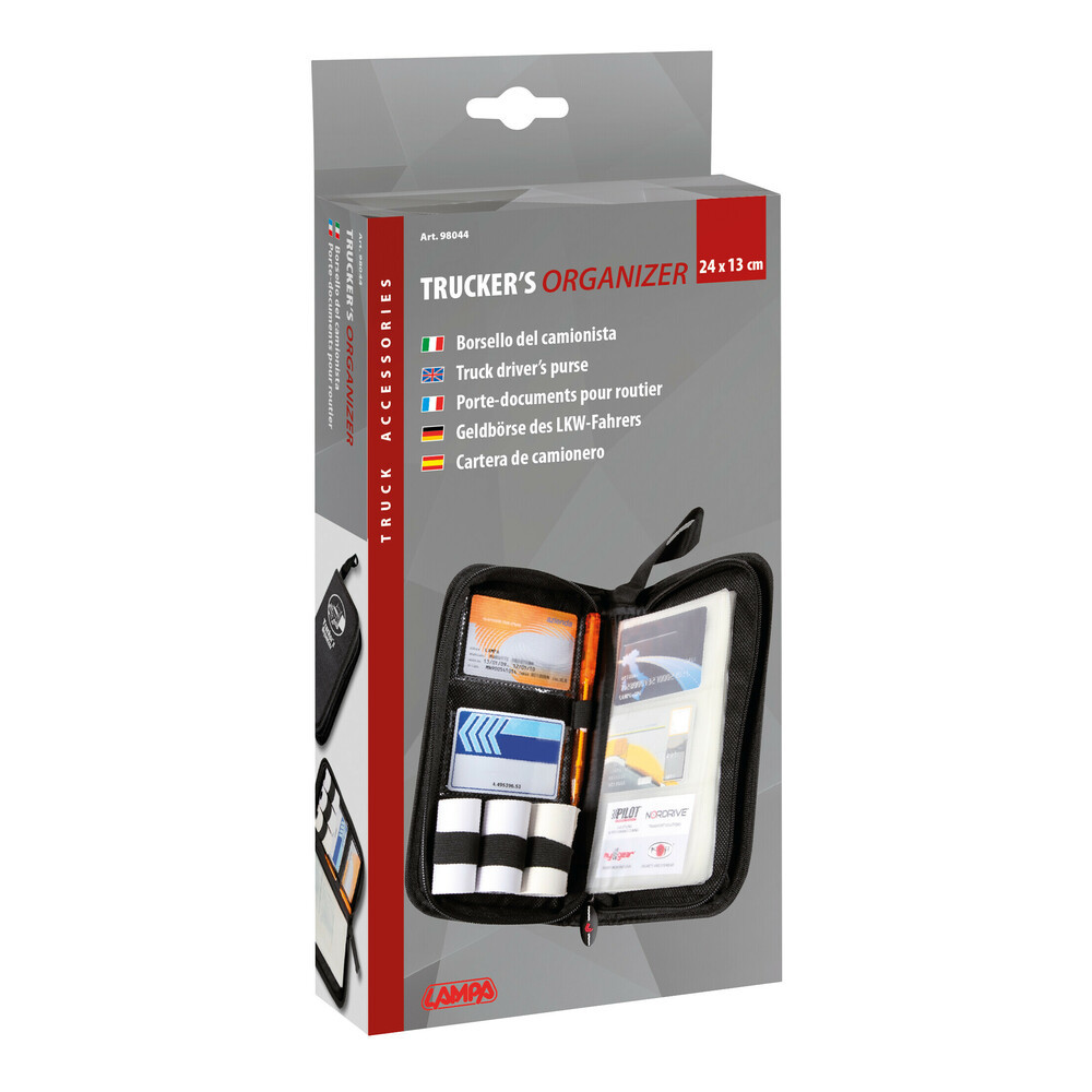 Több zseb hitelkártyák, névjegykártyák, üzemanyagkártyák és akár 120 napi tachográfnyomat tárolására.