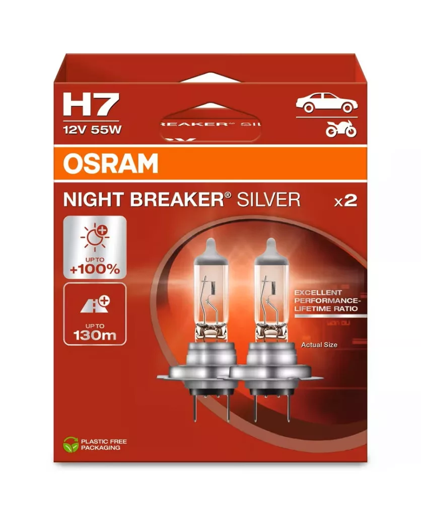 A NIGHT BREAKER SILVER az OSRAM optimalizált élettartamú nagy teljesítményű halogén autólámpája. Az OSRAM NIGHT BREAKER SILVER akár 100%-kal több fény nyújt összehasonlítva a minimum követelményekkel és akár 130 méter hosszú fénykévét hozz létre.