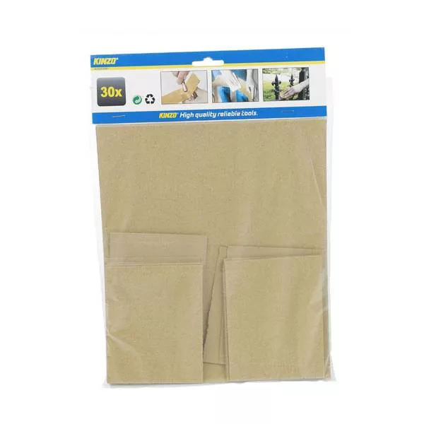 30 darab különböző érdességű csiszolópapírt tartalmazó csomag. 3 x G60 (230x280 mm) 3 x G150 (230x280 mm) 4 x G100 (230x280 mm) 6 x G60 (100x130 mm) 6 x G150 (100x130 mm) 8 x G100 (100x130 mm)