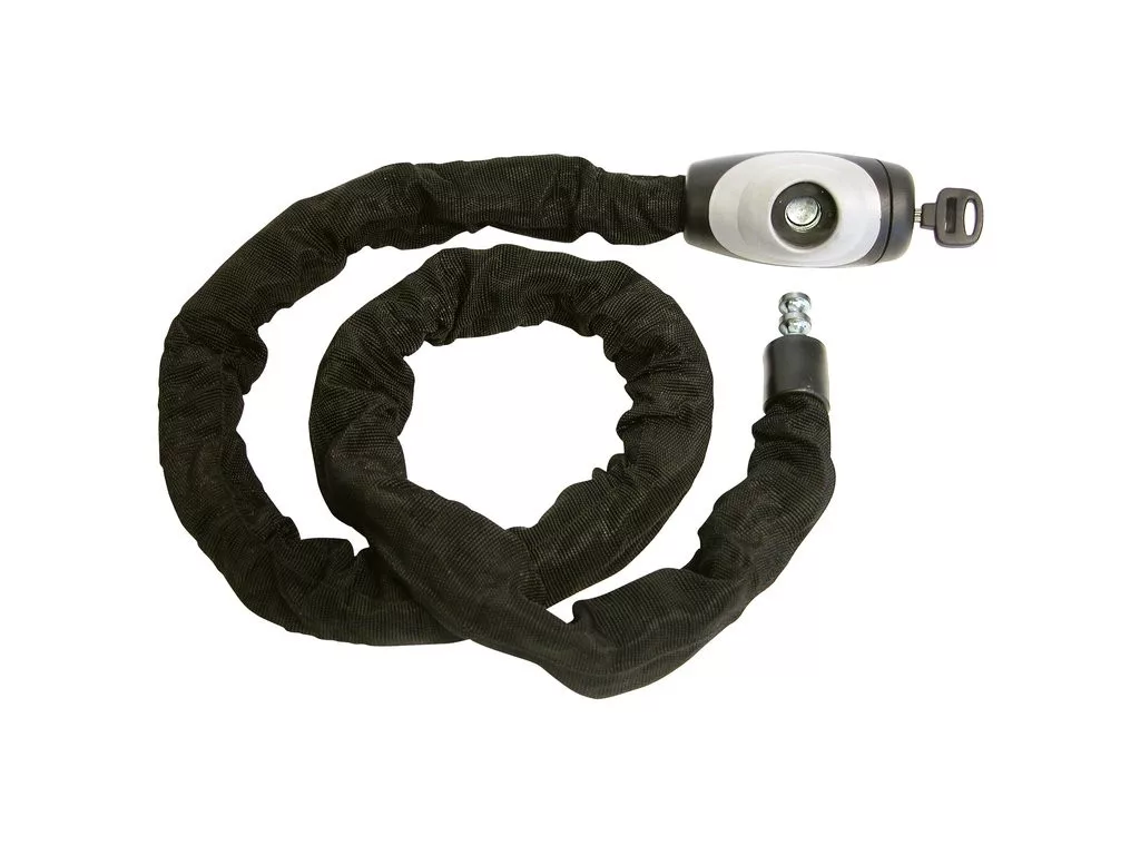 10 mm-es négyzet alakú láncszemek edzett acélból. Hossz: 140 cm. Masszív zárház a hengerzár védelmére. 2 db biztonsági kulcs.