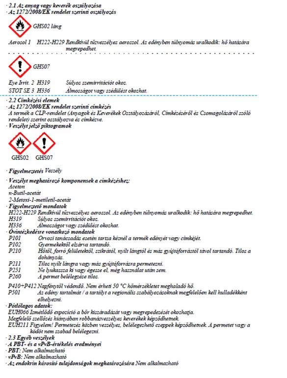 H229: Az edényben túlnyomás uralkodik: hő hatására megrepedhet.; H222: Rendkívül tűzveszélyes aeroszol.; H412: Ártalmas a vízi élővilágra, hosszan tartó károsodást okoz.; H315: Bőrirritáló hatású.; H336: Almosságot vagy szédülést okozhat. P102: Gyermekektől elzárva tartandó.; P210: Hőtől, forró felületektől, szikrától, nyílt lángtól és más gyújtóforrástól távol tartandó.; P211: Tilos nyílt lángra vagy más gyújtóforrásra permetezni.; P251: Ne lyukassza ki vagy égesse el, még használat után sem.; P260: Permet belélegzése tilos.; P410+P412: Napfénytől védendő. Nem érheti 50 °C/122°F hőmérsékletet meghaladó hő.